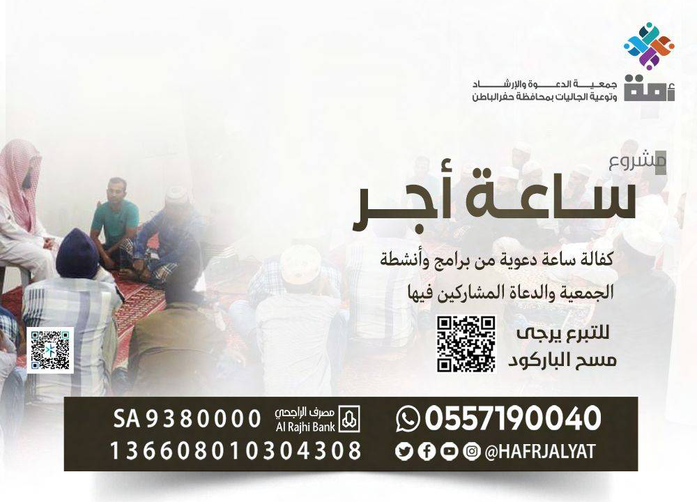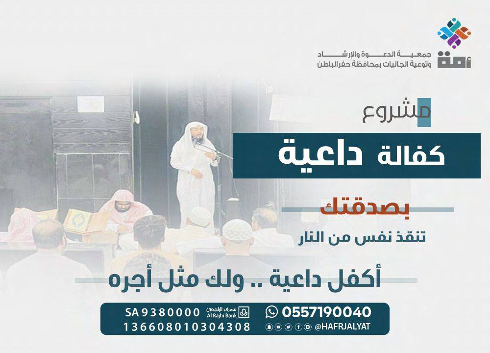 كفالة ساعة دعوية لدعاة الجاليات تشمل دعوة غير المسلمين للاسلام ومتابعة المسلمين الجدد وتوعية المسلمين منهم والجولات الدعوية و إقامة الدروس والمحاضرات وتوزيع الكتب والمطويات.